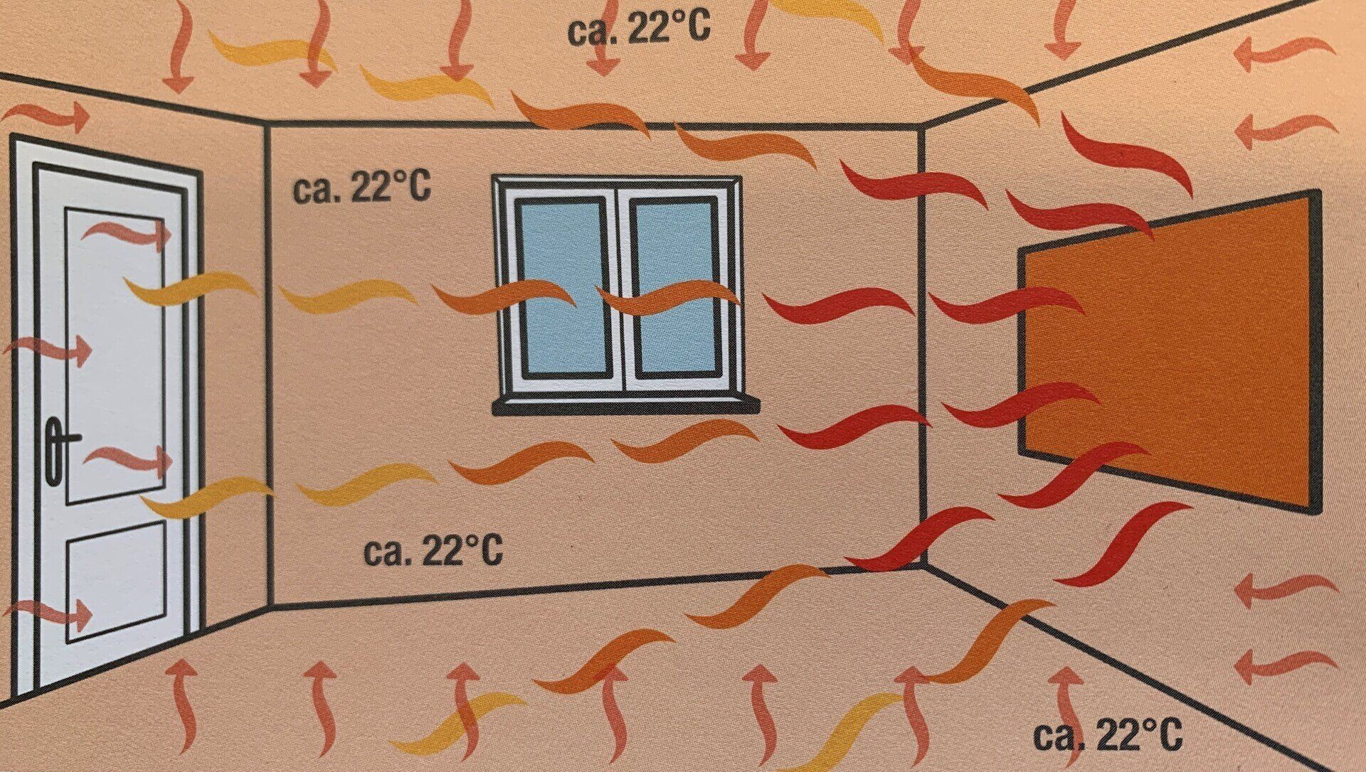 Die Infrarotheizung erwärmt Wände und Gegenstände im Raum. Dies sorgt für eine behagliche und wohlige Wärme.